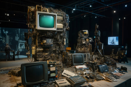 Electronic waste transformed into an artwork, blending vintage technology with artistic expression in a museum setting