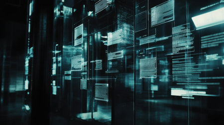 Explore a sleek tech interface featuring floating text elements and abstract designs. This modern composition showcases illuminated digital screens in a futuristic environment.