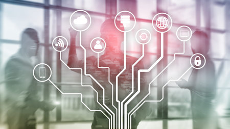 Telecommunication and IOT concept on blurred business center background.