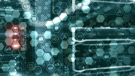 Digital internet connection technology concept. Icons on server rack room background.