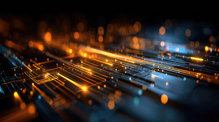 A detailed view of a futuristic circuit board showcasing intricate patterns and components in black, with glowing orange and gold accents, perfect for technology themes.