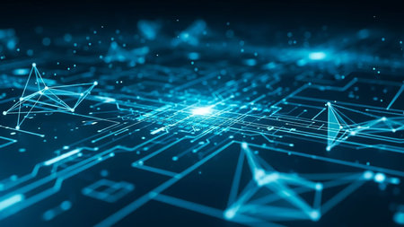 An abstract digital visualization of a glowing blue circuit board with interconnected nodes and lines, representing data flow and network connections.
