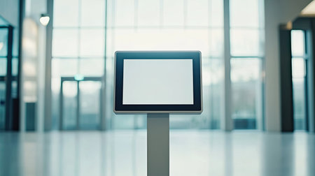 A modern interactive touchscreen sign in a minimalist lobby, with a blank display and ample copy space.