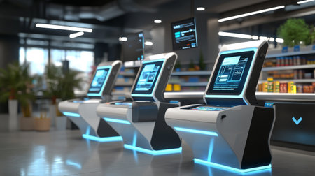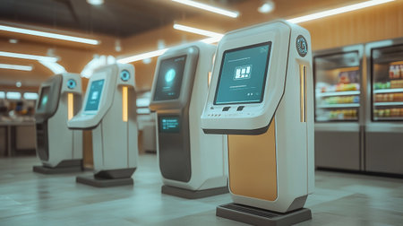 Multiple self-service kiosks are set up in a modern, well-lit environment designed for easy access.