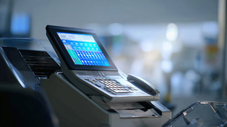 Medium shot of a modern digital fax machine displaying diagnostic results during line testing for enhanced data transmission reliability.