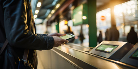 A traveler interacts with a self-service kiosk in an airport terminal, preparing for check-in as other passengers move in the background. Generative AI.