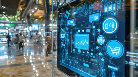 A sleek digital display showcases e-commerce analytics in a modern shopping space. The screen highlights data trends and insights, enhancing user engagement.