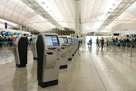 Automatic check-in machine in airport, boarding pass printer. Self-registration or registration online.