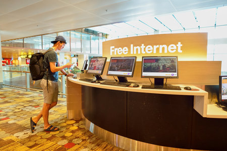 SINGAPORE - NOVEMBER 04, 2015: man use computer in Changi Airport. Singapore Changi Airport, is the primary civilian airport for Singapore