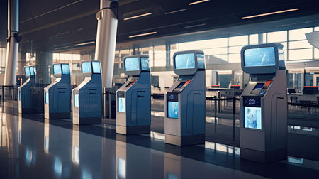 Close-up of automatic self-service self check-in kiosks in airport terminal. 3D rendering