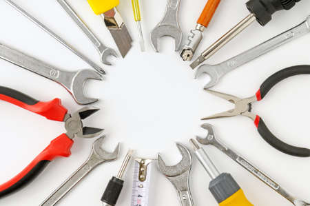 Different sizes of tools on a black table with copy space in the middle - Maintenance hand equipment pointing empty central space