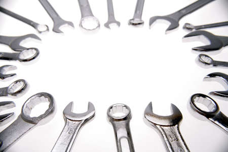 Flat lay of industrial engineering equipment, including wrenches, nuts, and bolts.