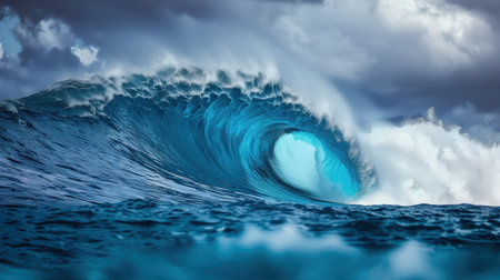 Stunning image of a massive blue ocean wave captured in the midst of its surging power under a dramatic, cloudy sky. The image exudes energy, strength, and the wild beauty of the natural forces.