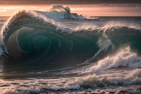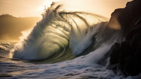 Close-up of a powerful ocean wave cresting and breaking at sunset or sunrise. Golden light illuminates the water's movement and intricate patterns, showcasing nature's beauty and dynamic energy.