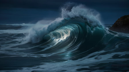 Powerful wave crests in ocean with teal glow, revealing nature's raw energy.
