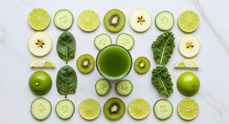 Healthy green detox smoothie with ice cubes, lime slices, mint leaves, and fresh fruits on a pastel background.