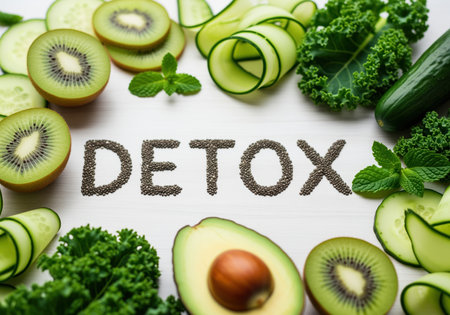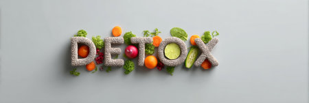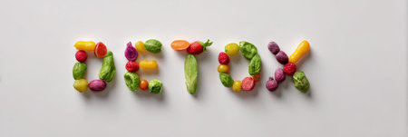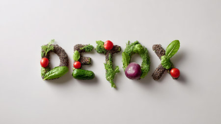 Vibrant arrangement of fresh vegetables spelling out detox on a neutral background, symbolizing cleansing, healthy eating, and overall well being through natural ingredients