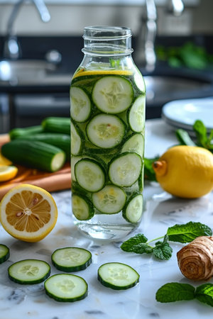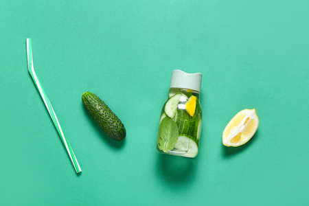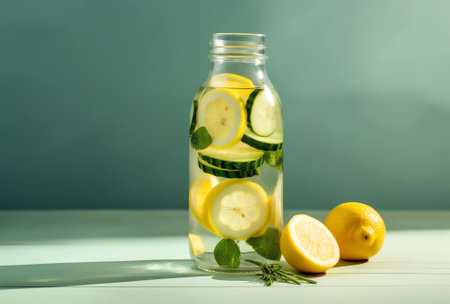 Generative AI : Health care fitness healthy nutrition diet concept Fresh cool lemon cucumber mint infused water cocktail detox drink lemonade in a glass jar Light copy space top vi