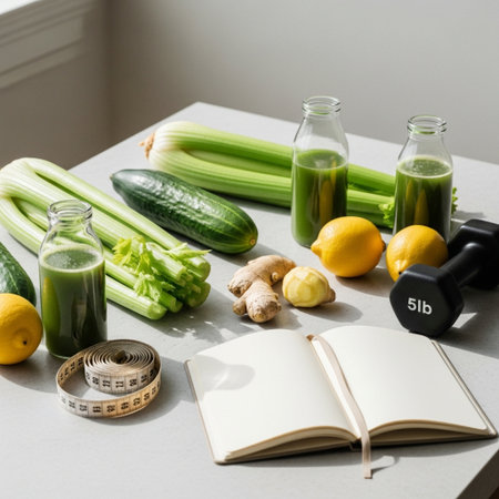 Fitness and healthy lifestyle concept. Fresh celery, cucumber, lemons, measuring tape, bottle of juice, notebook on table.