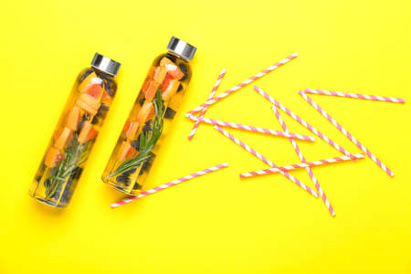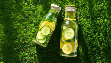 A refreshing bottle of infused water surrounded by fresh fruits and herbs, perfect for healthy hydration and vibrant lifestyle.