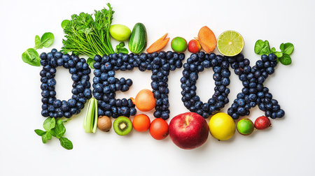Fresh fruits and vegetables arranged on a white background, spelling out detox, symbolizing a healthy eating concept and promoting body cleansing through natural ingredients