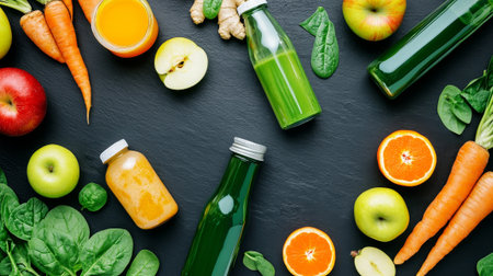 Bottles with fresh juice, apple, carrot, orange and spinach on black background. Top view.