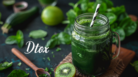 Healthy green smoothie with spinach, kiwi and lime in a glass jar on a dark background