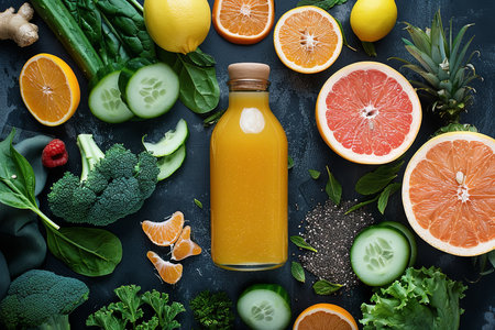 An arrangement of fresh fruits like oranges, lemons, and berries alongside a bottle of juice placed on a pastel green background. The colorful composition highlights health and freshness.