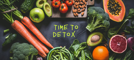 layout of vegetables and fruits with text in the center of the image time to detox, top view, healthy eating concept