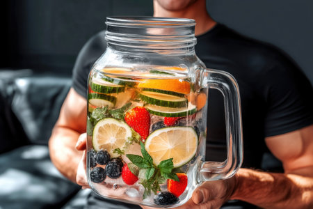 Man Holding Jar of Fresh Detox Water With Fruit and Mint Infusion – Healthy Hydration Concept.