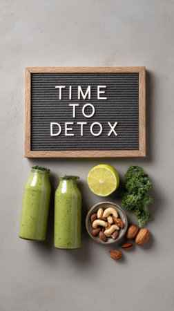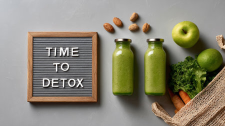 Two bottles of green smoothies resting on a gray surface beside a letter board reading time to detox, accompanied by fresh vegetables, nuts, and an apple, embodying a healthy lifestyle