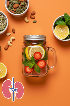 Flat lay composition of a glass jar filled with infused water containing lemon, strawberries, and mint, surrounded by nuts, seeds, cookies, and fresh fruits on an orange background. Kidney health symbols are included, emphasizing detox, hydration, and nutrition for renal wellness.