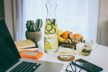 Morning time at home healthy breakfast laptop and phone on table. Natural meal and drink at work in remote office health nutrition food with computer, freelance desktop workspace. Home working concept