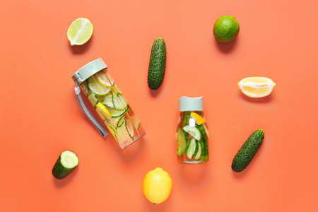 Plastic bottle mockup on empty pink background. Set from detox water with cucumber, mint and berries. Design bottle mockup. Beverage for healthy, sport or diet. Detox drink in transparent bottle