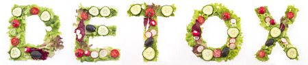 Colorful arrangement of fresh vegetables and chia seeds spelling out detox on a white background, symbolizing a healthy and natural approach to cleansing the body
