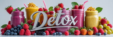 Detox concept. Colored healthy cocktails of fruits and vegetables in glass bottles with text above on white background, panorama
