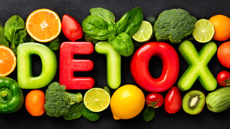 Colorful letters spelling detox are surrounded by a variety of fresh produce, promoting a healthy lifestyle