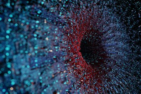 Point explode. Array with dynamic emitted particles. 3d technology style. Abstract background. Vector illustration.