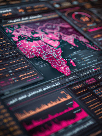 Digital map highlights geographical data with visual analytics, emphasizing key statistics and trends in a tech-driven environment, likely in an office.