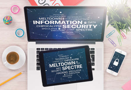 Information security concept with Meltdown and Spectre threat on laptop tablet and smartphone screens