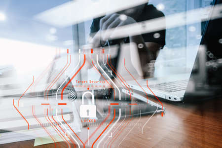 Businesswoman hand using laptop with Data protection, Cyber security secure, information safety and encryption concept. internet technology and business concept.