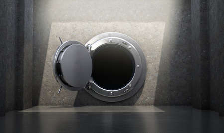 A concept of an open heavy metal walk in bank vault ina concret chamber spotlit by an overhead light - 3D render