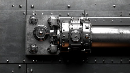 Close-up view of an industrial mechanical component featuring intricate gears and controls on a metallic surface, ideal for engineering and design projects.