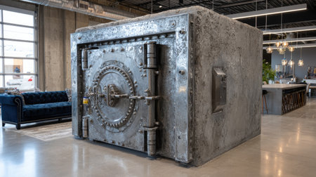 This striking industrial vault stands as a centerpiece in a contemporary interior, showcasing its unique texture and design. Perfect for creative spaces.