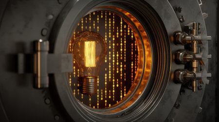 Vintage light bulb illuminates vault door, surrounded by glowing binary code, symbolizing fusion of technology and security. scene evokes sense of mystery and innovation