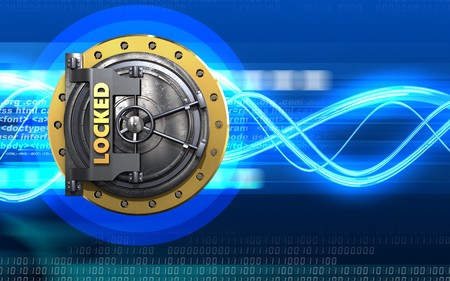 3d illustration of locked vault door over digital waves background