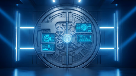 An open bank vault reveals a glowing blue and yellow digital data and circuit network inside.