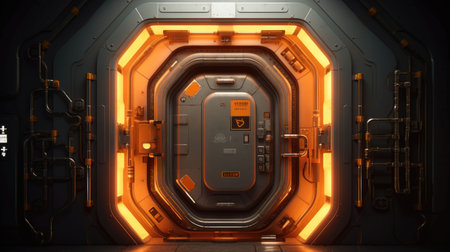 An AI-generated illustration of a spaceship door made of metal with orange lights around it in