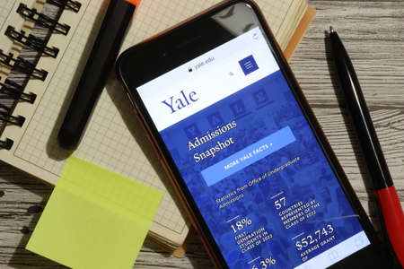 Los Angeles, California, USA - 7 December 2019: Phone screen with Yale University website page top view. Higher education admission concept, Illustrative Editorial.