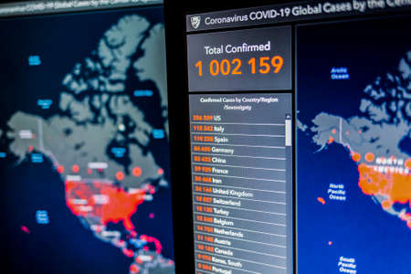 Over 1 million. Number of Total Confirmed Cases. Coronavirus COVID-19 global cases Map Johns Hopkins University map on monitor display.